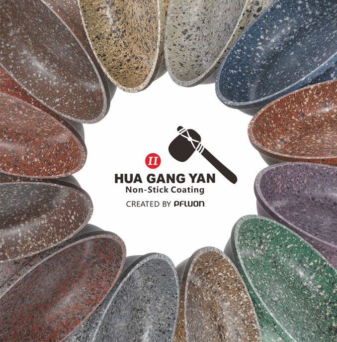 Трехслойное покрытие Pfluon Hua Gang Yan также оценивается по максимуму в разрезе антипригарных свойств и износоустойчивости. Главное отличие данного покрытия лежит в декоративной плоскости - за счет многоточечного распыления смешанных цветов удается на сковородах воспроизвести текстуру натурального гранита.
