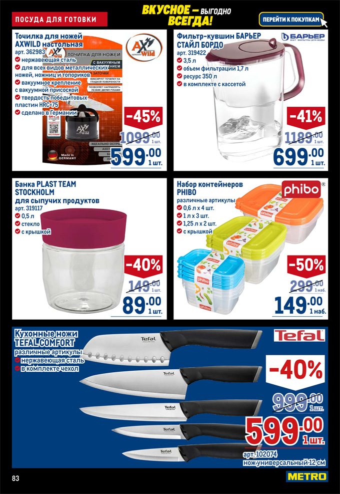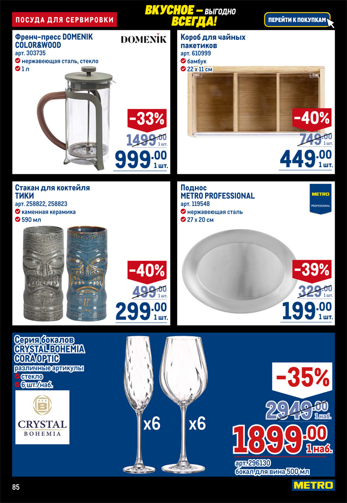 В сети магазинов METRO с 20 ноября по 3 декабря 2025 года действуют специальные цены на товары из акционного каталога. В посудном разделе представлена продукция торговых марок "Нева металл посуда", Esprado, Tefal, TVS, Polaris, Metro Professional, Luminarc, DOmenik, Crystal Bohemia и др.