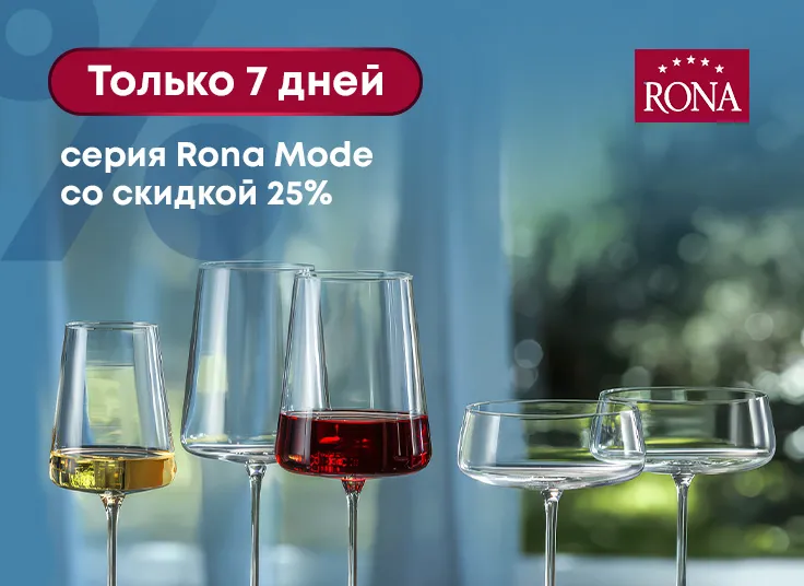 До 28 декабря 2025 года в компании "Комплекс-Бар" проводится акция. На бокалы Rona Mode действует скидка в размере 25%. В серии представлены разные бокалы для вина, шампанского, высокие и низкие стаканы.