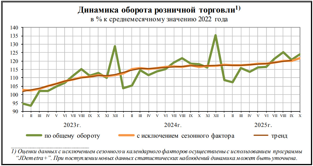 Озвученными задачами экономических властей РФ были охлаждение экономики и снижение инфляции - и обе они реализовывались в 2025 году. Оборот розничной торговли в январе-октябре 2025 года вырос на +2,4% с тенденцией к небольшому увеличению. По сравнению с динамикой прошлого года (+7,5%) темпы роста упали в три раза, но небольшой прирост остался. Официальная инфляция на октябрь 2025 года выросла на +8,8% (инфляция по итогам 2024 года составила +11,5%). Потребительские ожидания оказались ниже прошлогодних: индекс по итогам 4 квартала составил -11% (-9% в 4 квартале 2024 года).
