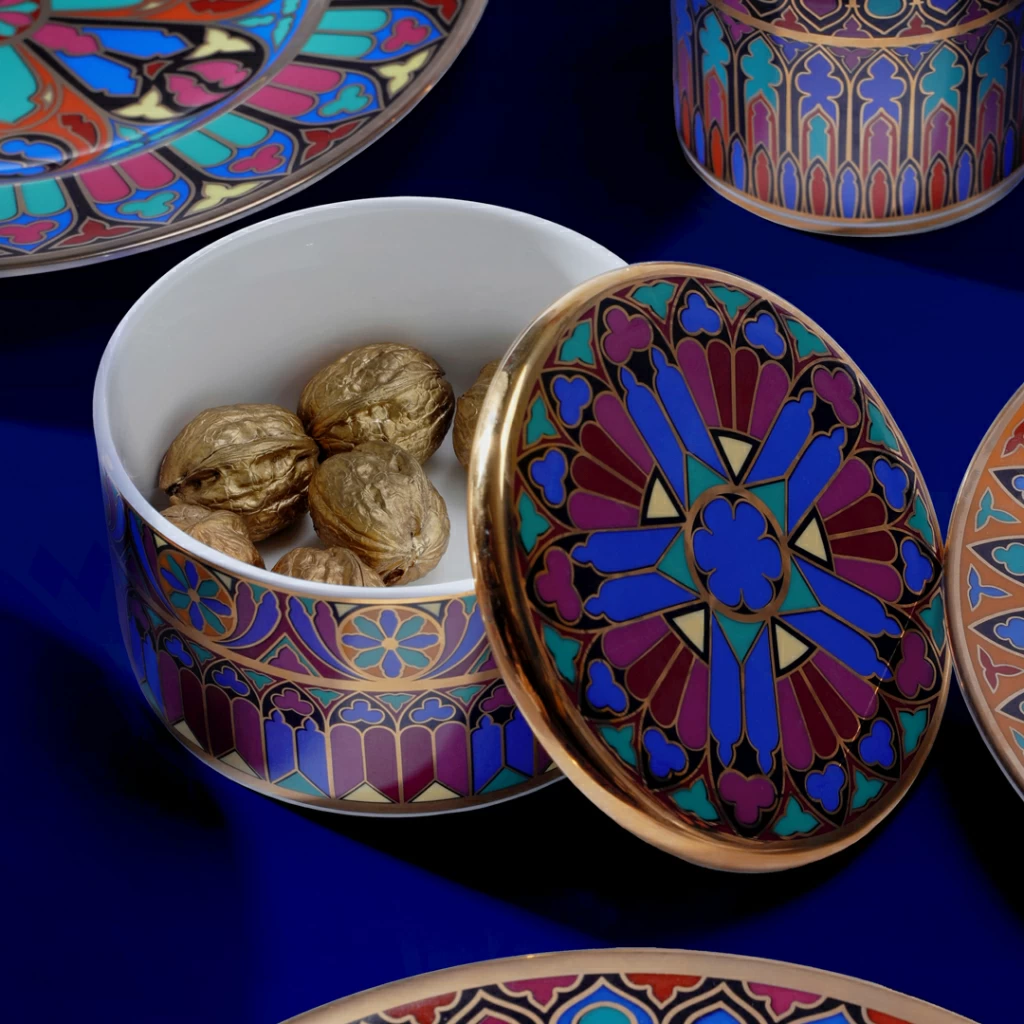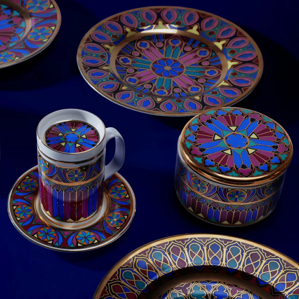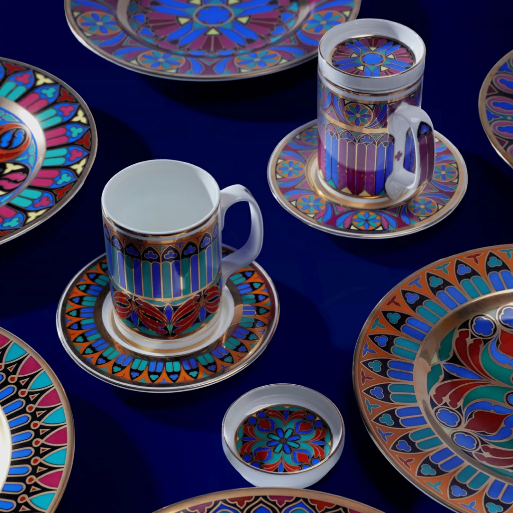 В новую коллекцию вошли бокалы с блюдцем и крышкой, шкатулка, а также серия интерьерного парфюма в формате свечи и диффузора. Каждый предмет украшает рисунок, выполненный в стиле готических витражей, отражает величие и загадочность этого стиля, подчеркивает форму изделий и красоту костяного фарфора.