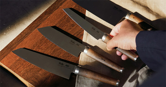 В коллекции представлены шеф-нож, сантоку, нож для мяса и китайский нож с широким лезвием.