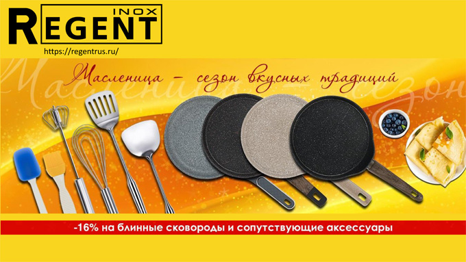 В компании Regent inox проводится акция. На блинные сковороды и кухонные принадлежности к Масленице действует скидка в размере 16%.