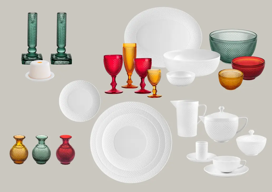 Коллекция посуды из стекла BICOS от Vista Alegre дополнилась новыми формами и цветами, расширив возможности по сервировке стола. Так, фарфоровый сервиз Bicos с рельефными узорами на белой глазури Идеально сочетается с бокалами, кувшинами, салатницами и мисками той же коллекции, а также с самыми разнообразными наборами посуды и столовых приборов.