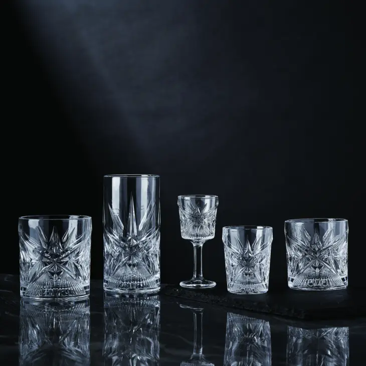 Бокалы коллекции Cielo выполнены из гравированного хрустального стекла. Созданные с использованием передовых технологий, изделия отличаются прозрачностью и точностью узоров, сочетания современный дизайн с эстетикой хрусталя. В коллекции входят бокалы для виски, лонг-дринков, кофе, ликеров и воды. Каждое изделие украшено звездным мотивом с обеих сторон, окруженным геометрическими узорами.