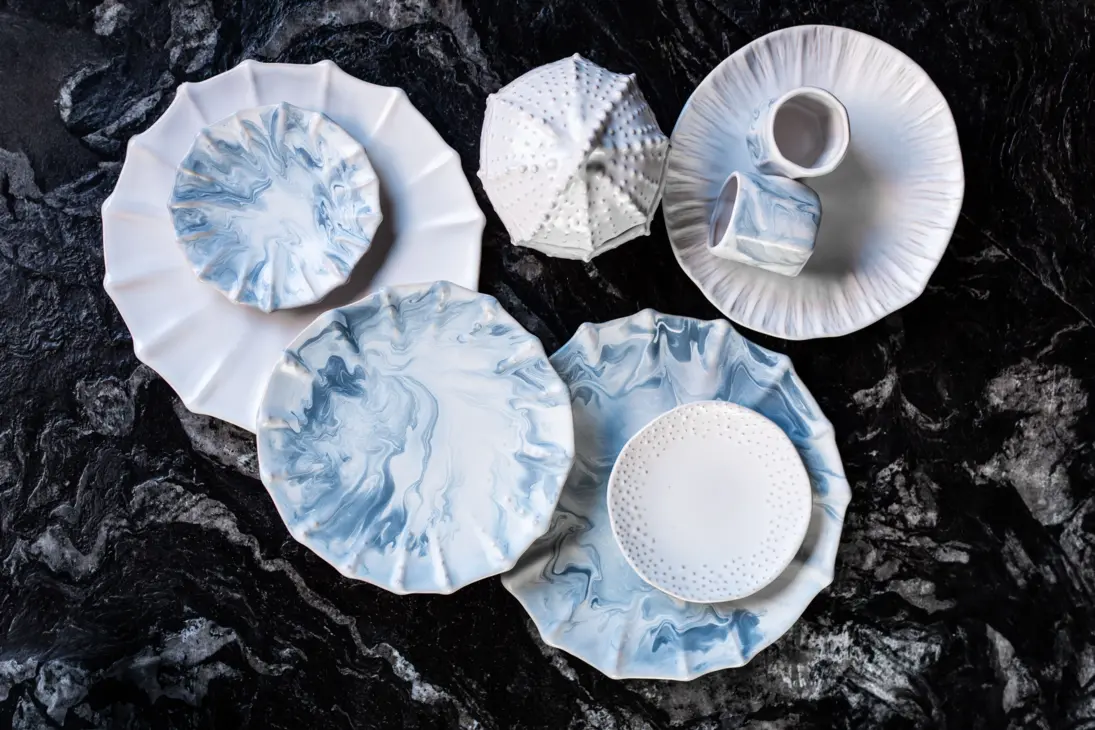 Коллекция Sea отражает движение морских волн на матовых мраморных поверхностях с помощью глубоких оттенков синего. Каждое изделие является уникальным и приглашает к чувственному взаимодействию, когда форма, текстура и цвет сливаются воедино, превращая накрытый стол в пространство для созерцания и общения.