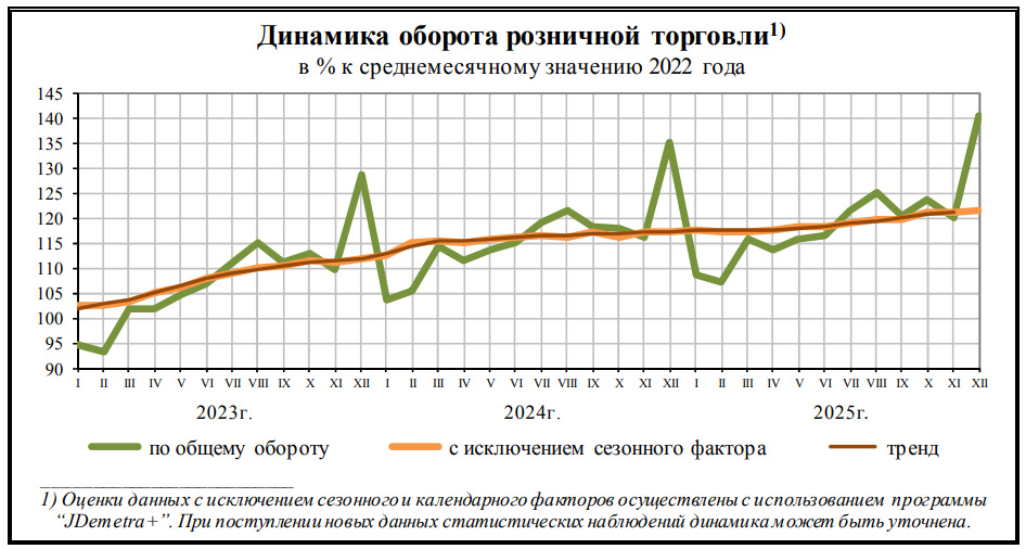 По данным Росстата, оборот розничной торговли в 2025 г. составил 61 315,0 млрд рублей, или 102,6% (в сопоставимых ценах) к 2024 г., в декабре 2025 г. - 6 133,2 млрд рублей, или 103,9% к уровню соответствующего периода предыдущего года.