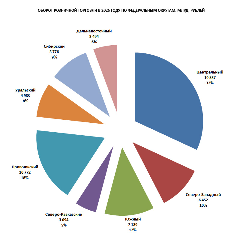 Весь прошлый год экономика РФ испытывала последствия правительственных мер по «охлаждению» и снижению инфляции, что сказалось и на динамике розничной торговли. Итоговый рост ритейла за 2025 год по сравнению с 2024 годом составил 2,6% (для сравнения, рост в 2024 году к 2023 году был на уровне 7,2%). Общий объем розничной торговли за 2025 год достиг 61,3 трлн. рублей.