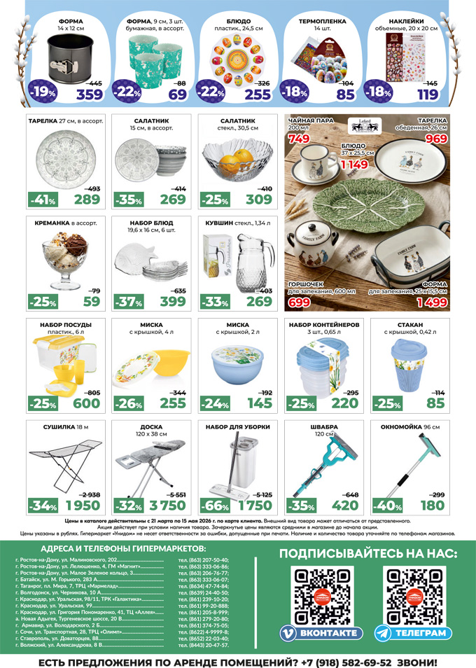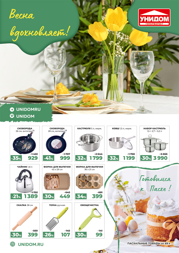 В гипермаркетах "Унидом" с 21 марта по 15 мая 2026 года проводится акция. На товары из каталога "Весна вдохновляет" действуют специальные сниженные цены. В акции представлена посуда для приготовления и сервировки, кухонные принадлежнсти, хозяйственные товары и т.д.