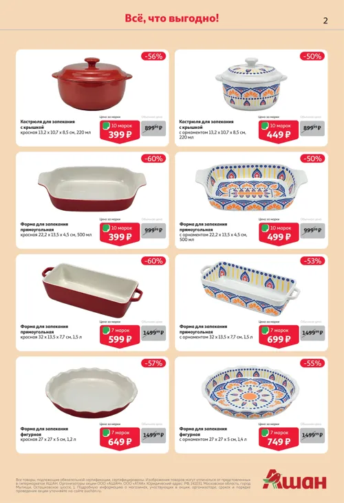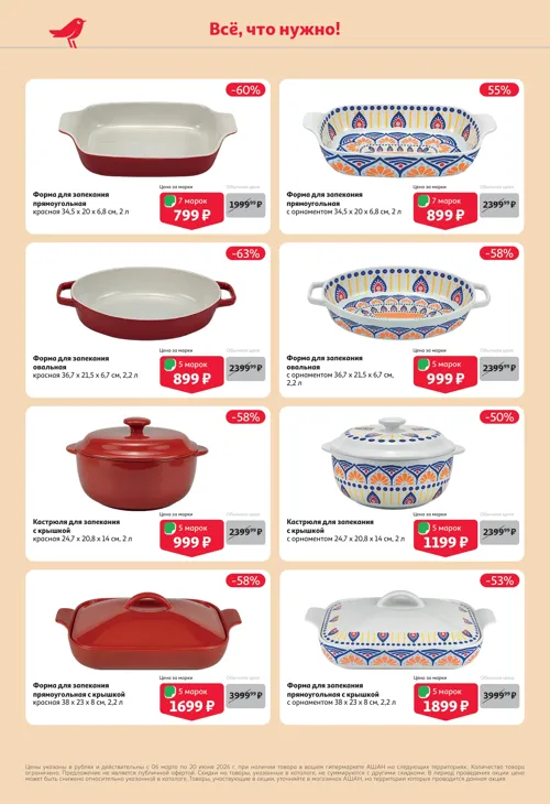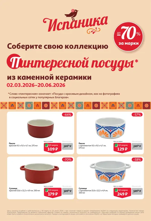 До 20 июня 2026 года в сети магазинов "Ашан" проводится акция лояльности на коллекцию посуды из каменной керамики "Испаника" собственной торговой марки Actuel. За каждые 400 рублей в чеке до 06.06.2026 покупатели получают марки, определенное количество которых позволяет приобрести акционную продукцию со скидкой до 70%.
