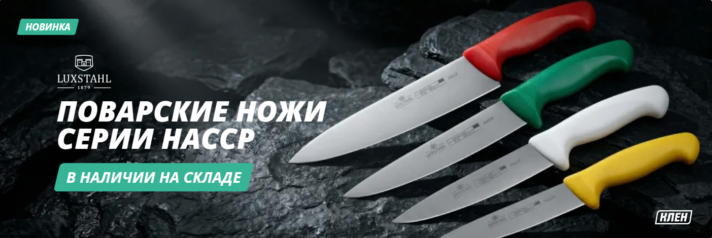Компания "Клен" представила новую серию профессиональных кухонных ножей HACCP (ХАССП)* торговой марки Luxstahl. Рукоятки ножей выполнены из пластика со специальной текстурой, предотвращающей скольжение. Разный цвет рукояток (белый, коричневый, красный, синий, зеленый и желтый) способствует предотвращению перекрестного загрязнения.