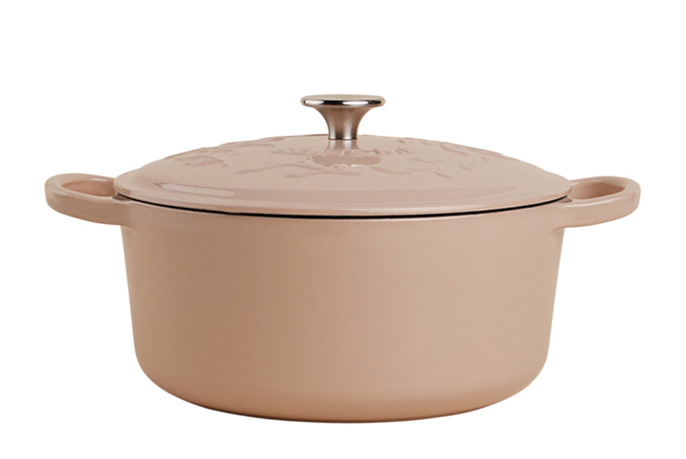 Дизайн кастрюли российской марки PVHOME отсылает к классике от Staub, ручка крышки выполнена из нержавеющей стали. Внешнее и внутреннее покрытие выполнено в светлом оттенке. Вес кастрюли - 4,2 кг.