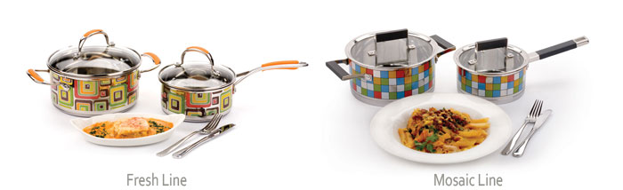 Деколь – декоративное покрытие на поверхности стальной посуды линейки Fresh Line – представляет собой многоцветный геометрический рисунок – стильный и современный. Этот рисунок украшает каждый прибор серии. Всего же Fresh Line включает в себя: